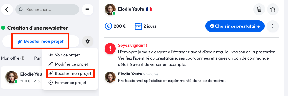 1. Depuis la messagerie de votre projet dont le statut est "ouvert" ou "en travail", vous pouvez cliquer sur "Booster mon projet".