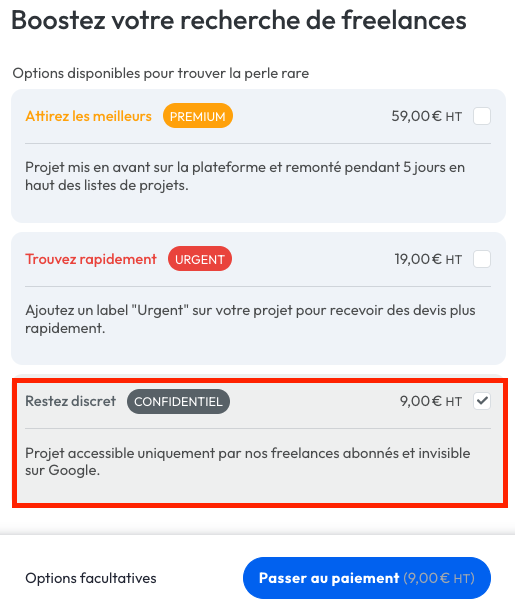 La confidentialité de votre projet est une option payante sur Codeur.com.