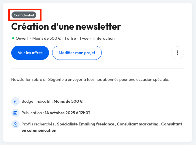 A tout moment sur Codeur.com, vous pouvez rendre votre projet confidentiel et uniquement visibles par les freelances.