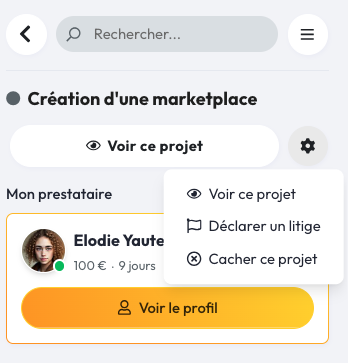 1. Depuis la messagerie de votre projet fermé ou terminé, cliquez sur l'icône de réglages.