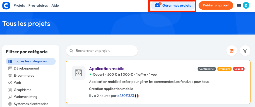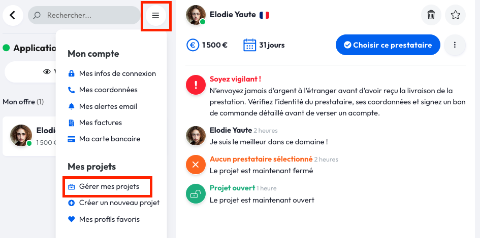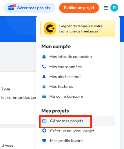 Depuis cette même interface, vous pouvez également accéder à vos projets en cours en cliquant sur le menu, en haut et à droite de votre écran. Puis, cliquez sur "Gérer mes projets".