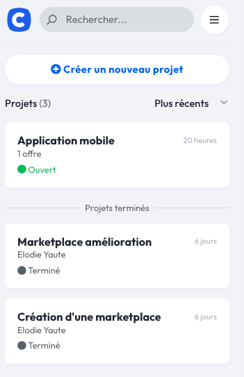 Après avoir utilisé l'une des deux méthodes, vous accédez à la liste de vos projets. Vous pouvez ensuite filtrer leur affichage en les classant par statut : ouvert, en cours, terminés et plus récents.