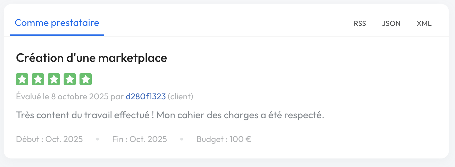 Les évaluations sont données à la fin du projet, après livraison de la prestation si celle-ci s'est bien déroulée. Elles concernent les conditions de réalisation du projet (respect des indications et des dates) et de communication avec le prestataire.