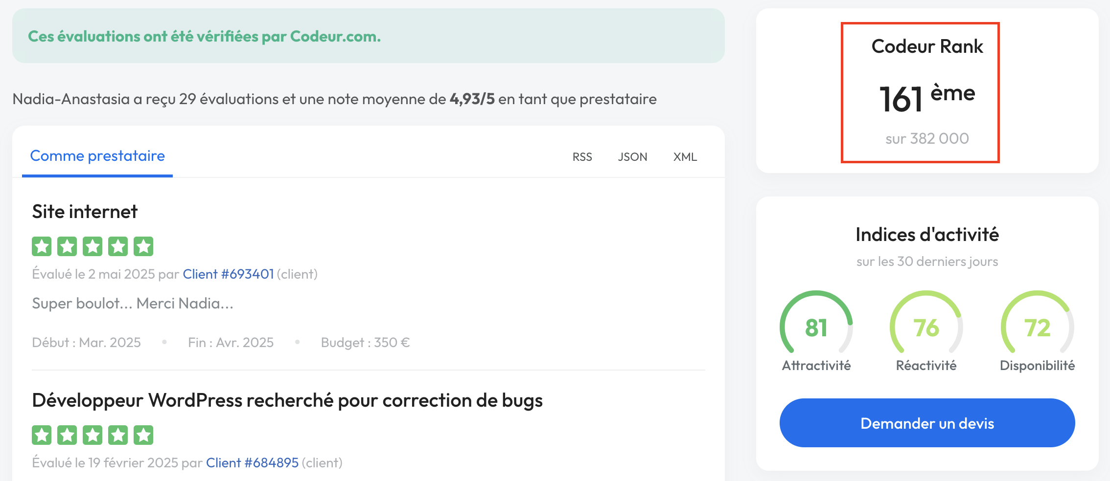 A noter que vous pouvez aussi tenir compte du classement du freelance sur le Codeur Rank. Cette information est visible lorsque vous vous rendez sur le profil du freelance.