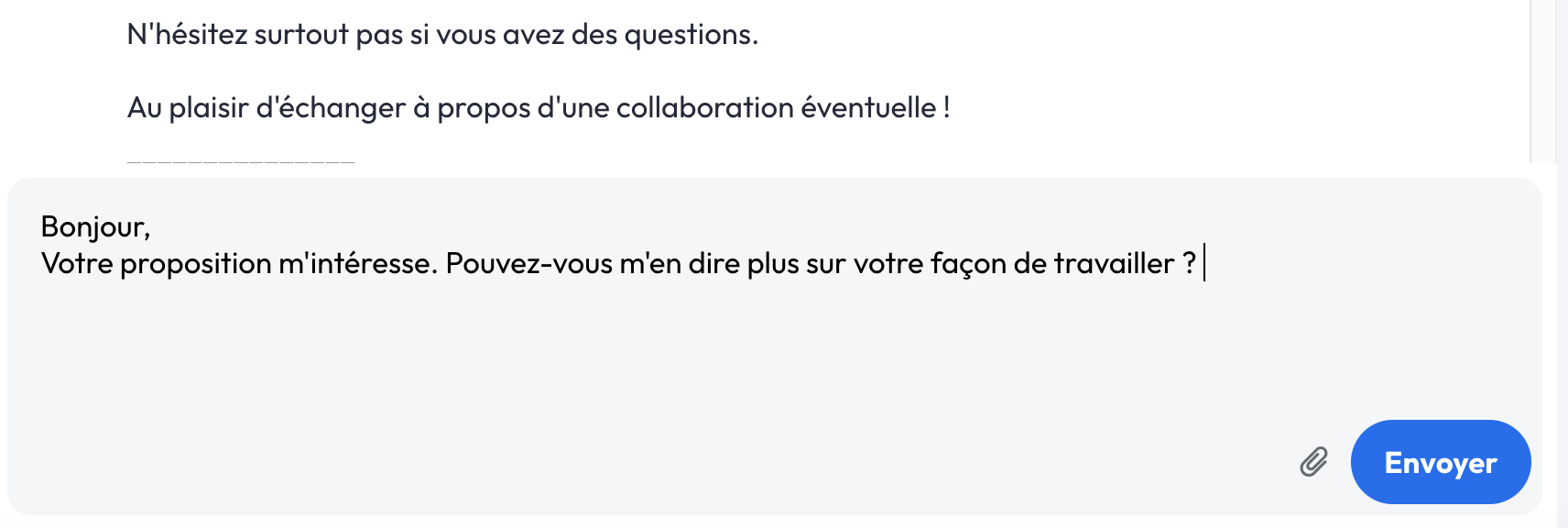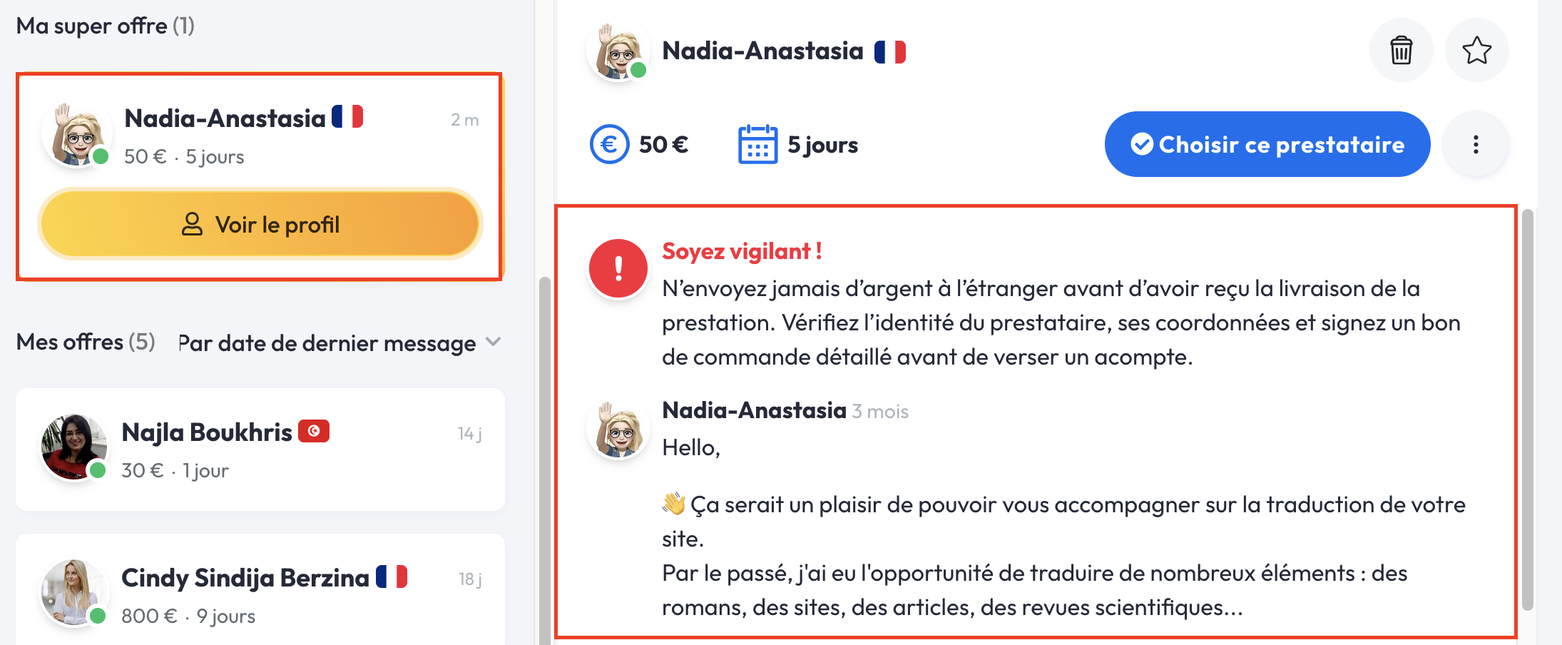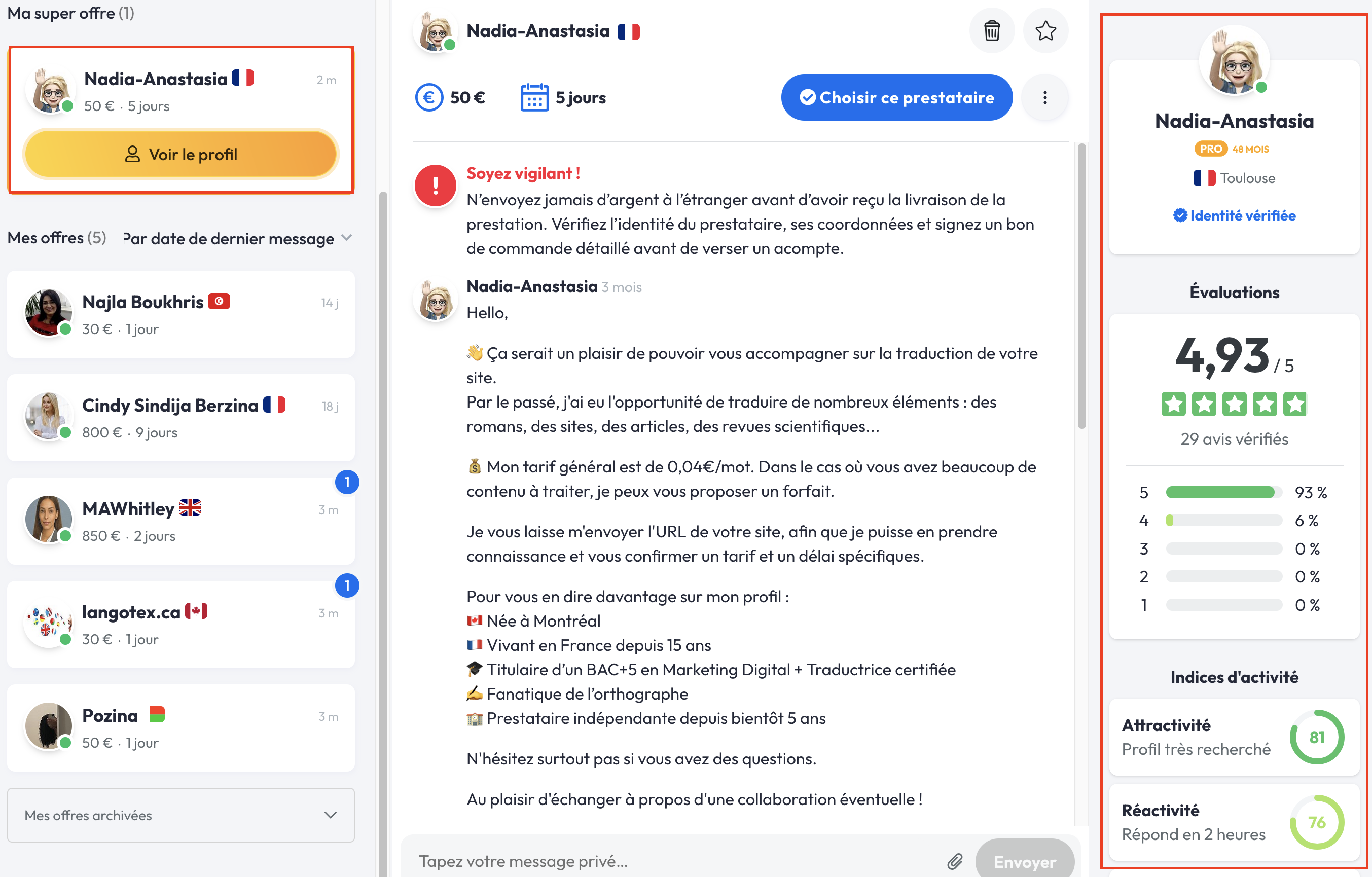 Si l'offre d'un des freelances correspond à vos attentes alors n'hésitez pas à échanger avec lui via la messagerie privée.