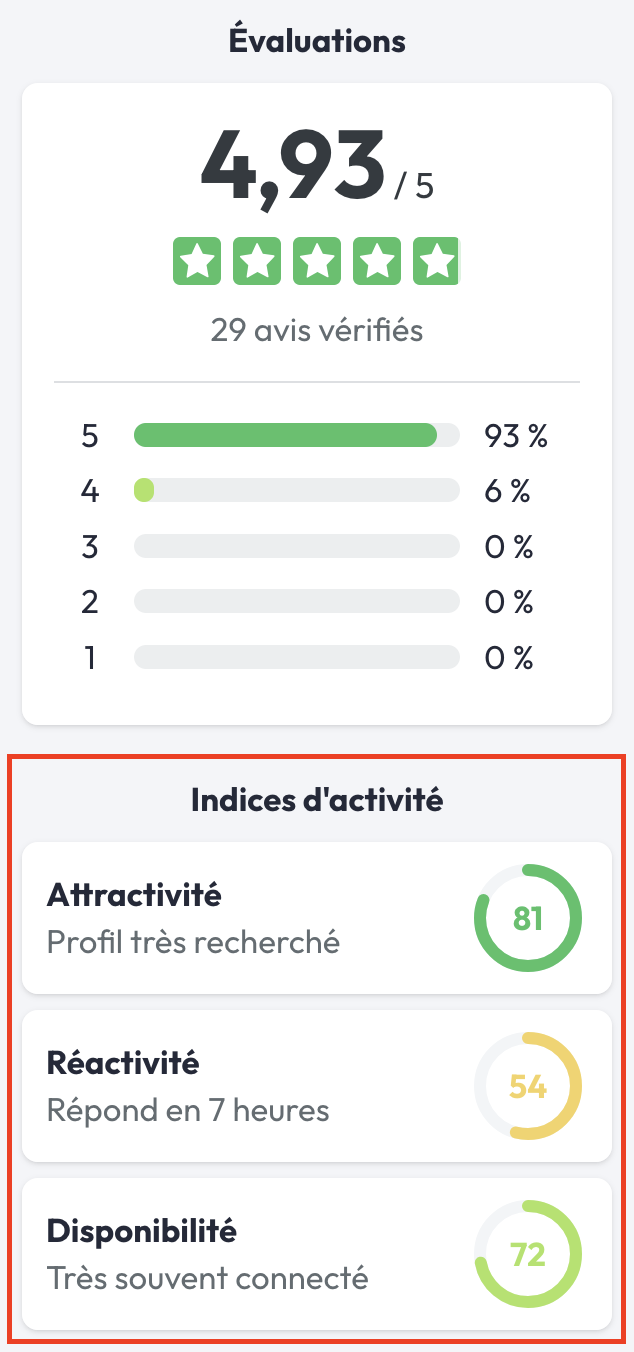 Lorsque vous faites défiler vers le bas le profil du freelance, à droite de votre écran, à la suite de sa notation, vous accédez aux indices d'activités et statistiques de ce dernier. Ces données vous permettent d'apprécier sa réactivité, sa disponibilité et sa présence sur Codeur.com.
