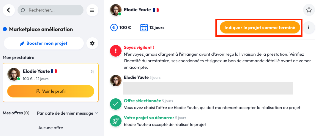 Une fois la livraison de la prestation faite par votre prestataire, vous pouvez marquer votre projet comme "Terminé".