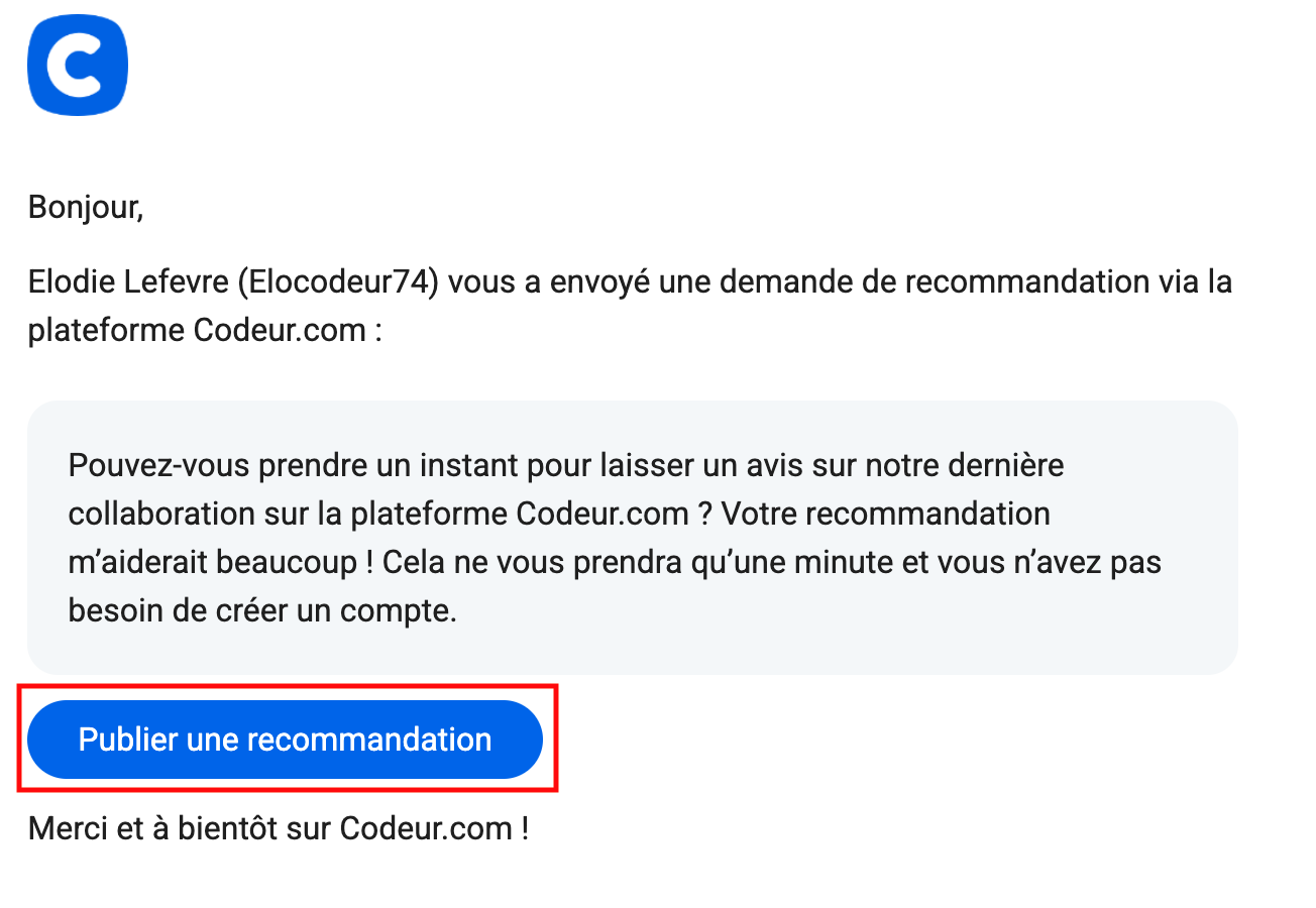 Pour pouvoir publier une recommandation sur un profil freelance sur Codeur.com, il faut que votre freelance vous envoie une demande de recommandation par mail, comme ci-dessous.