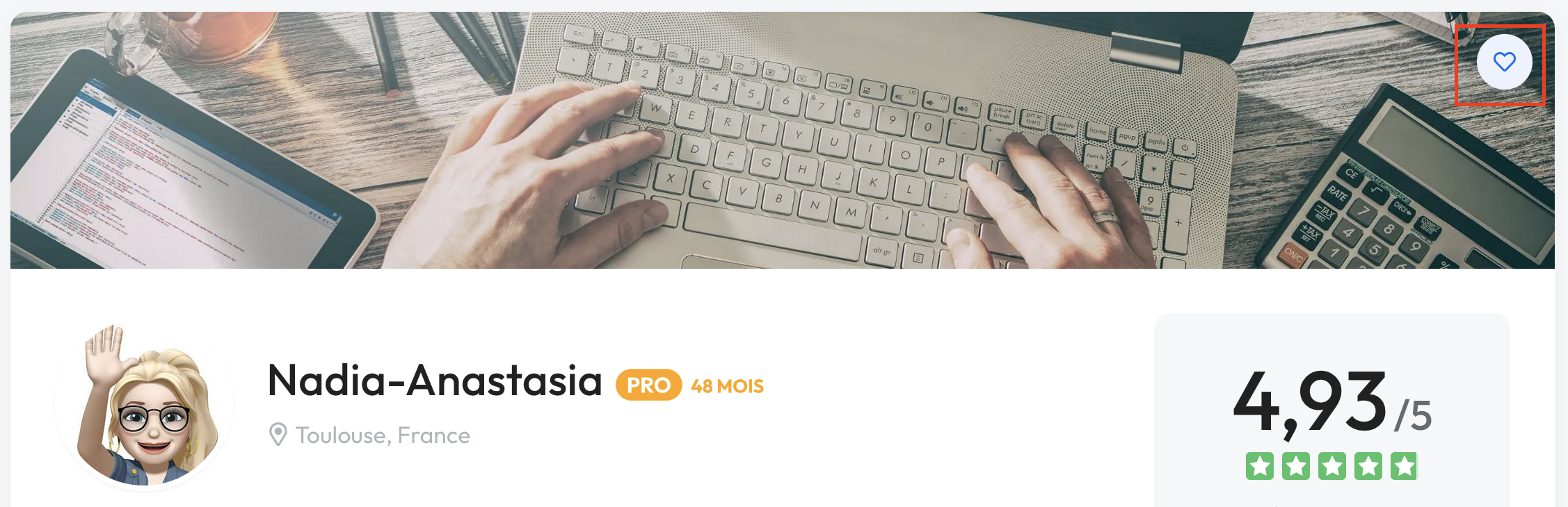 Pour placer un prestataire en favoris, il vous suffit de vous rendre sur le profil de ce dernier et de cliquer sur l'icône "Coeur" en haut, à droite de votre écran.