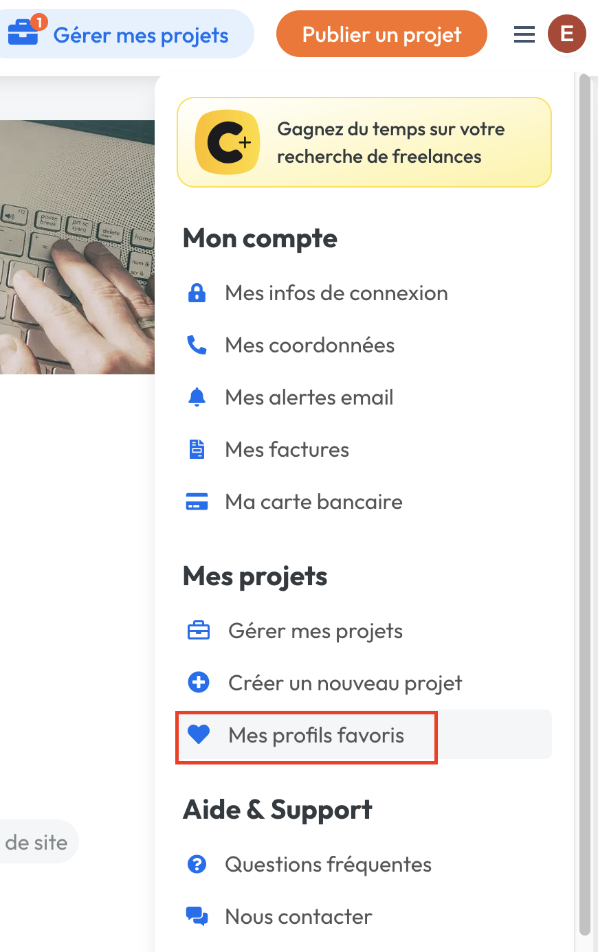 Pour accéder à la liste de vos prestataires favoris, rendez-vous sur votre menu déroulant, en haut, à droite de votre écran. Puis cliquez sur "Mes profils favoris".