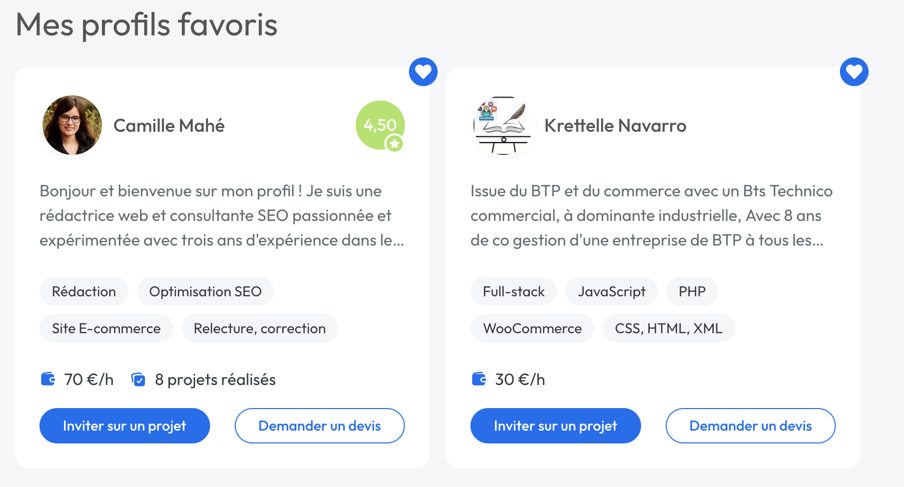 Retrouvez ensuite tous les profils des prestataires que vous avez mis en favoris.