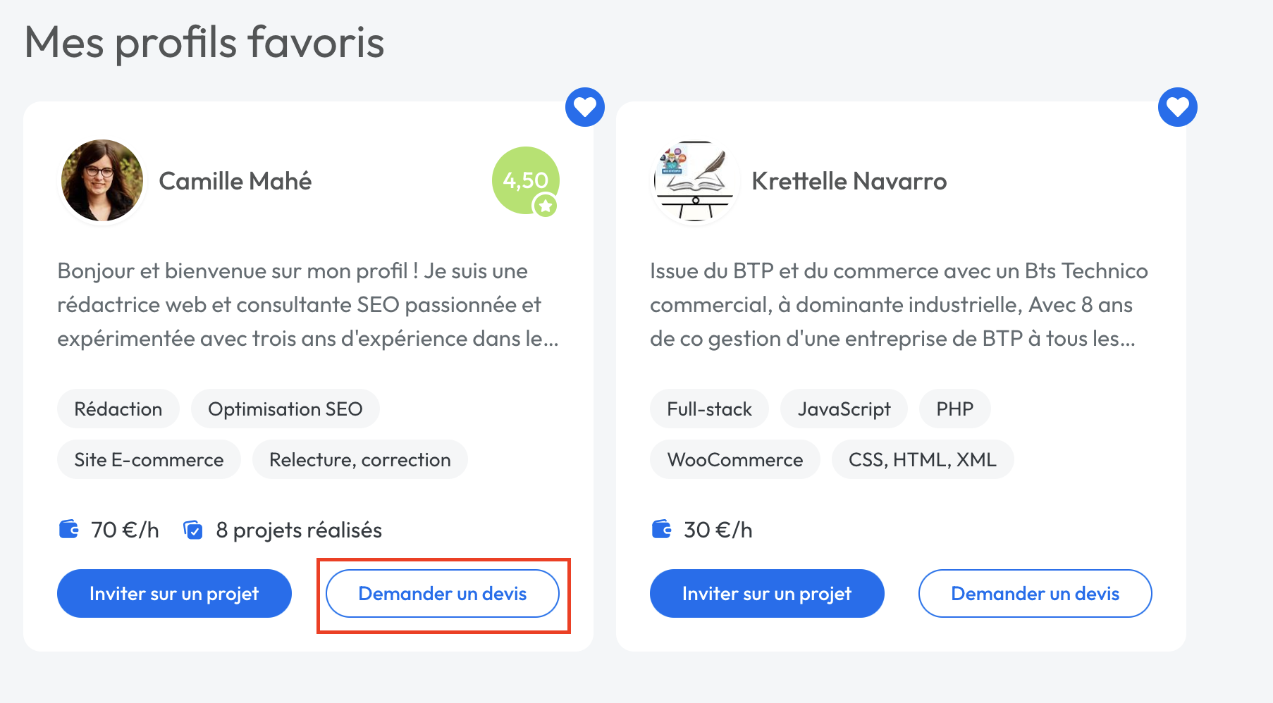 Si vous êtes satisfait de la prestation réalisée par le freelance sélectionné pour votre projet, vous avez la possibilité de mettre ce dernier dans vos favoris et de retravailler avec lui plus facilement.