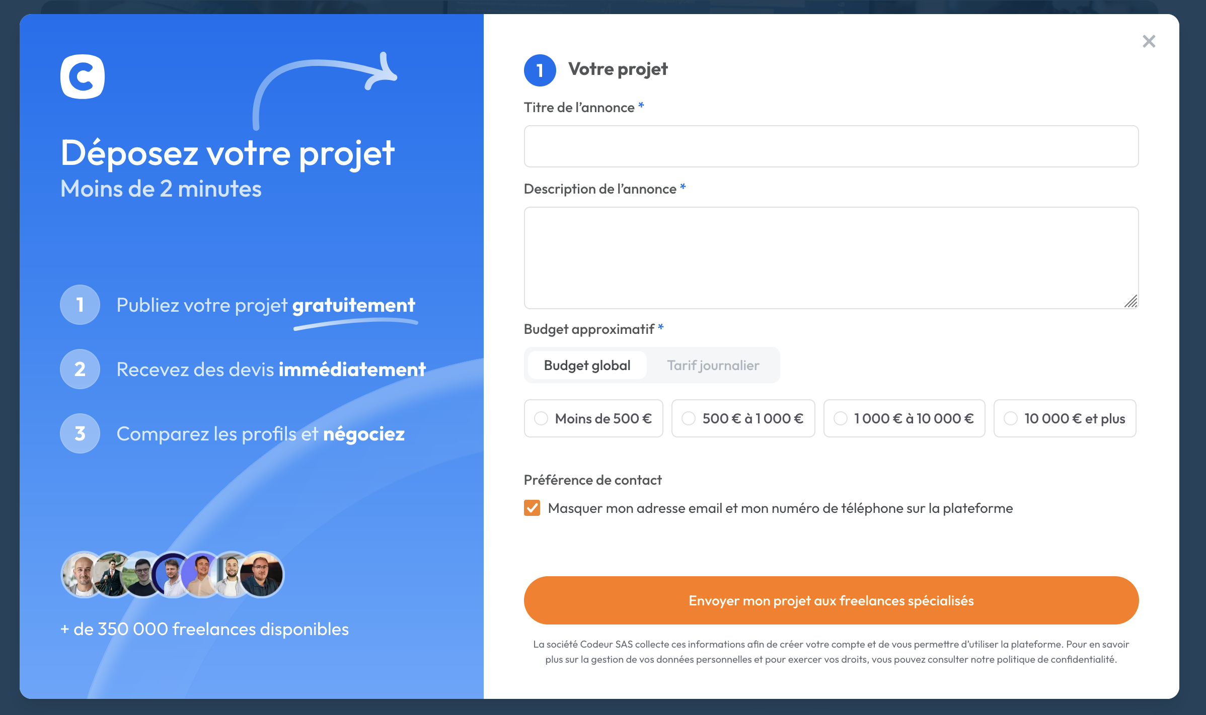 2. Accédez ensuite au formulaire pour déposer un projet, remplissez les champs obligatoires et publiez votre projet en cliquant sur "Envoyer mon projet aux freelances spécialisés".