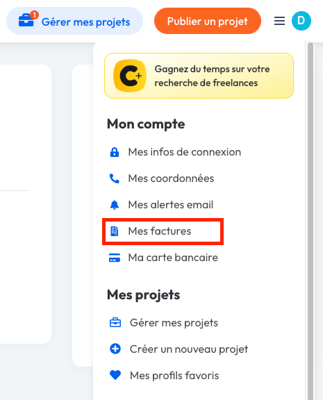 1. Après avoir procédé au paiement de ses options, vous pouvez retrouver vos factures depuis votre menu déroulant en cliquant sur "Mes factures".