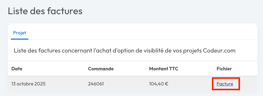 2. Accédez ensuite à la liste de vos factures et cliquez sur "Facture" à droite de chaque ligne pour visualiser l'aperçu de la facture.