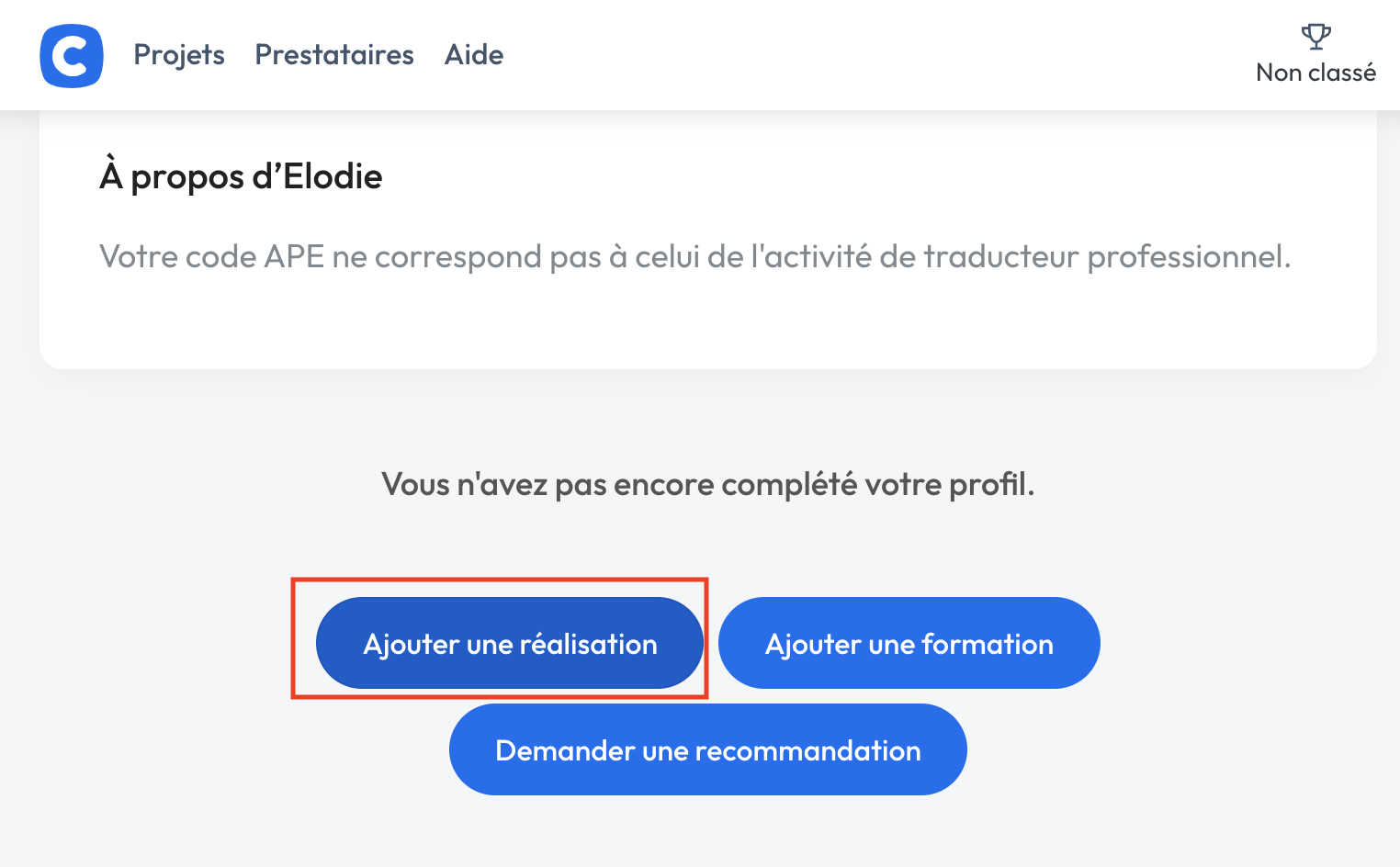 Compléter votre profil en ajoutant vos réalisations crédibilise davantage vos compétences et votre professionnalisme envers les porteurs de projets.