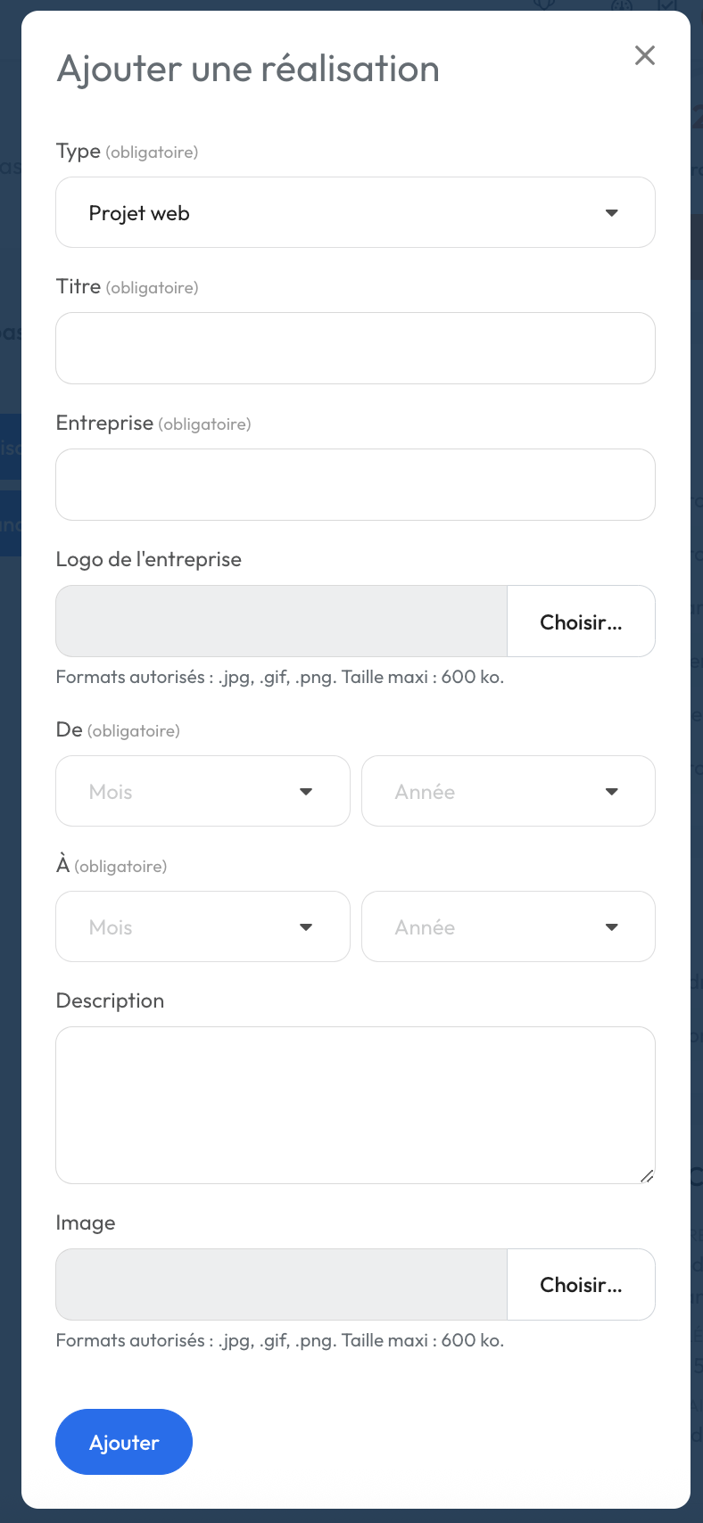 3. Complétez tous les champs obligatoires de la fenêtres avec les informations de vos réalisations. Soyez le plus précis possible.