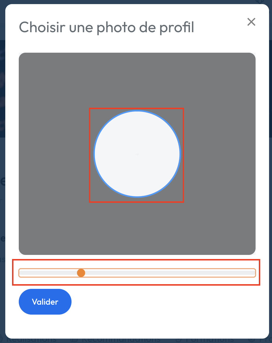 4. Une fois la photo chargée sur Codeur.com, vous pouvez choisir la partie de la photo à utiliser et ajuster la taille de cette dernière à l'aide du sélecteur rond et de la barre verticale.