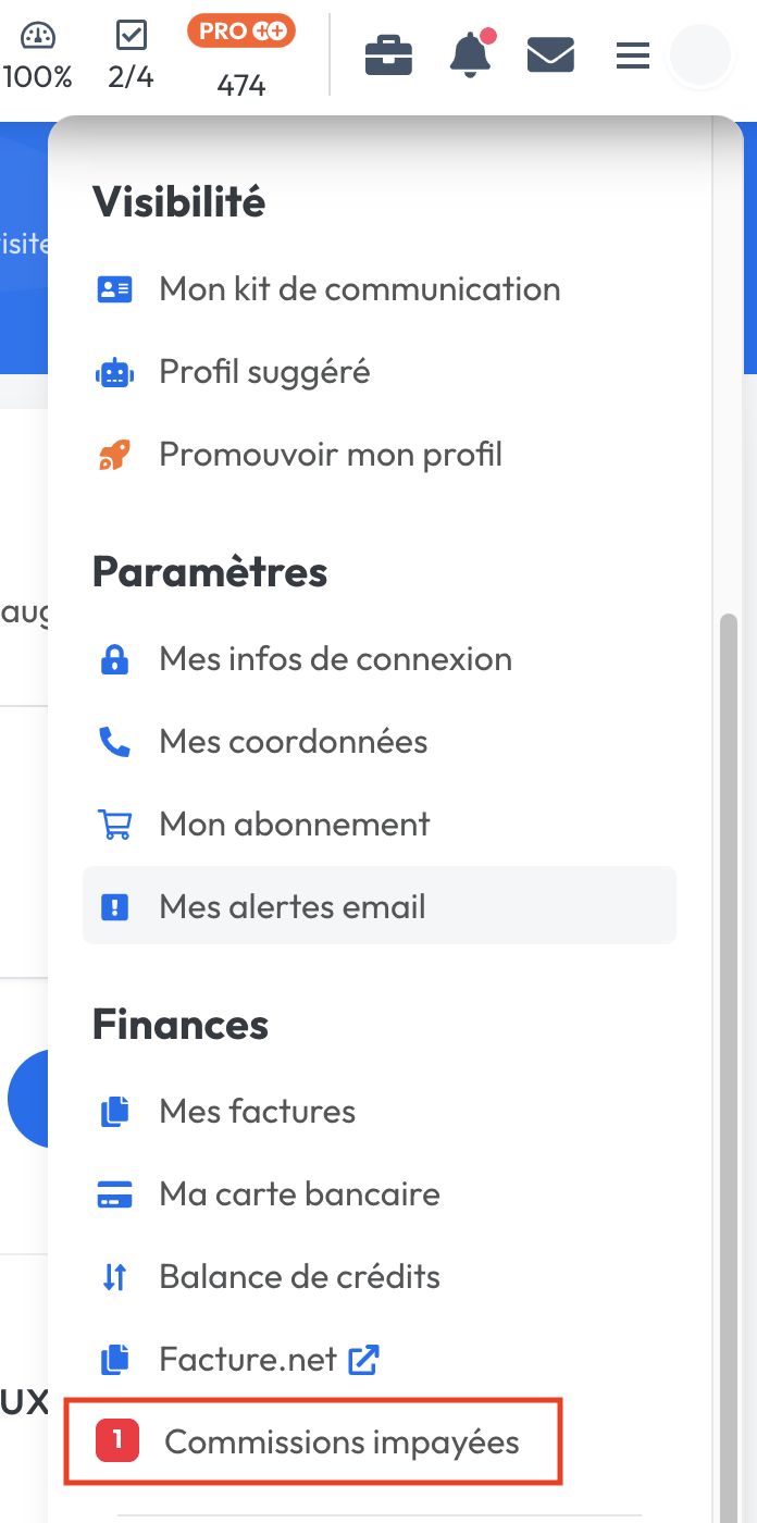 1. Depuis votre menu d'actions, cliquez sur "Commissions impayées".