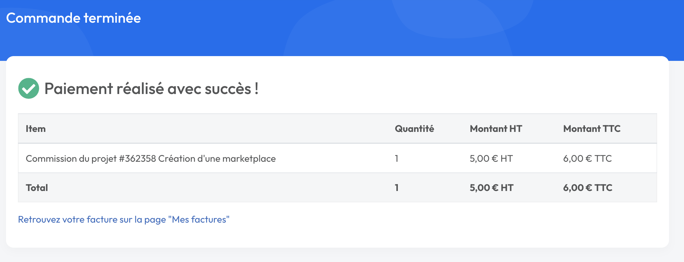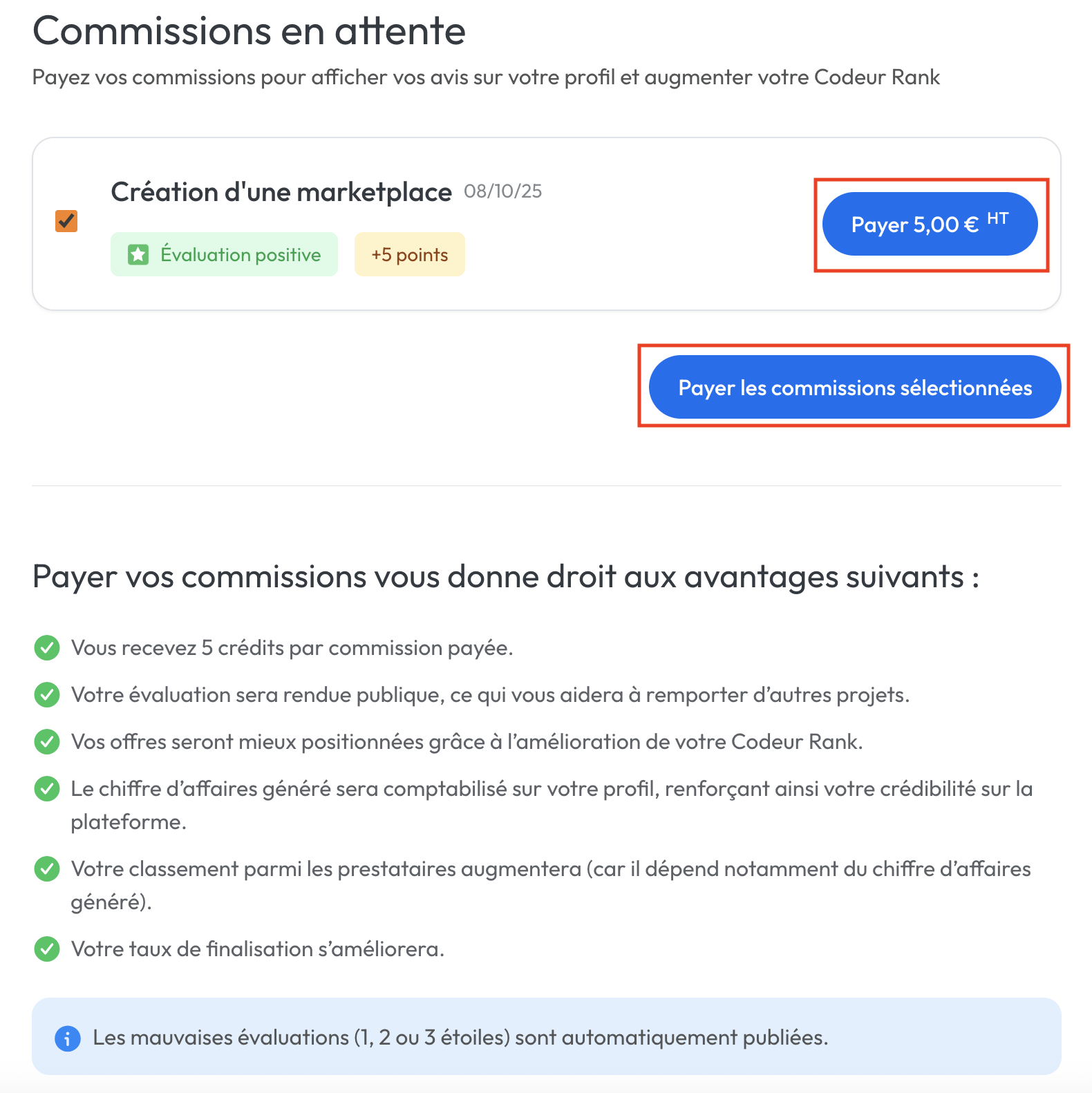 La commission est une sommes à payer par le prestataire lorsqu'un projet est terminé et qu'un porteur de projet a laissé un avis avec une note de 4/5 ou 5/5.