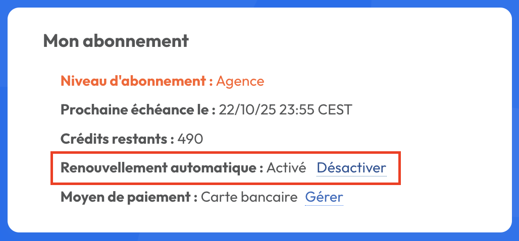 Vous pouvez stopper le renouvellement automatique de votre abonnement à tout moment avant l'échéance du paiement en cliquant sur "interrompre le renouvellement automatique" via la page Mon abonnement.