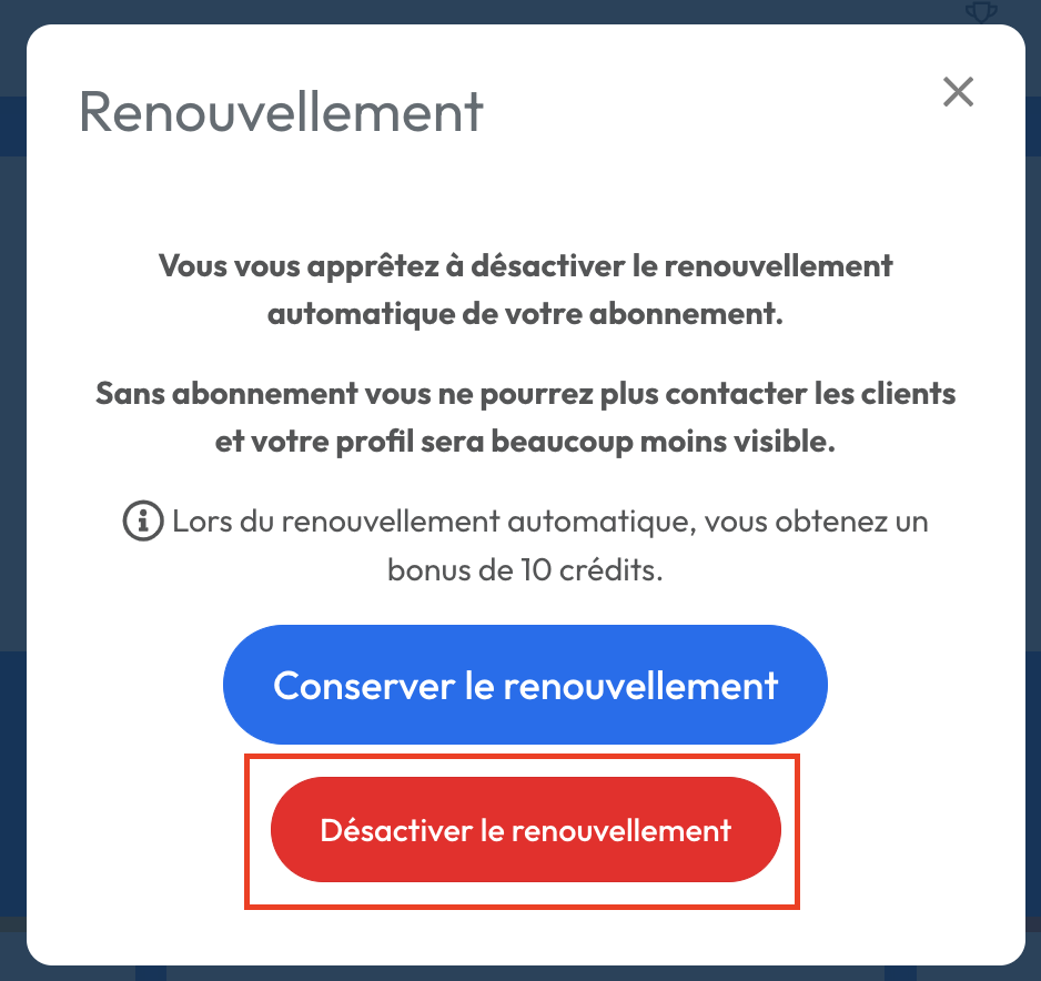3. Puis, sur la nouvelle fenêtre qui s'ouvre confirmez votre choix en cliquant sur "Désactiver le renouvellement automatique".