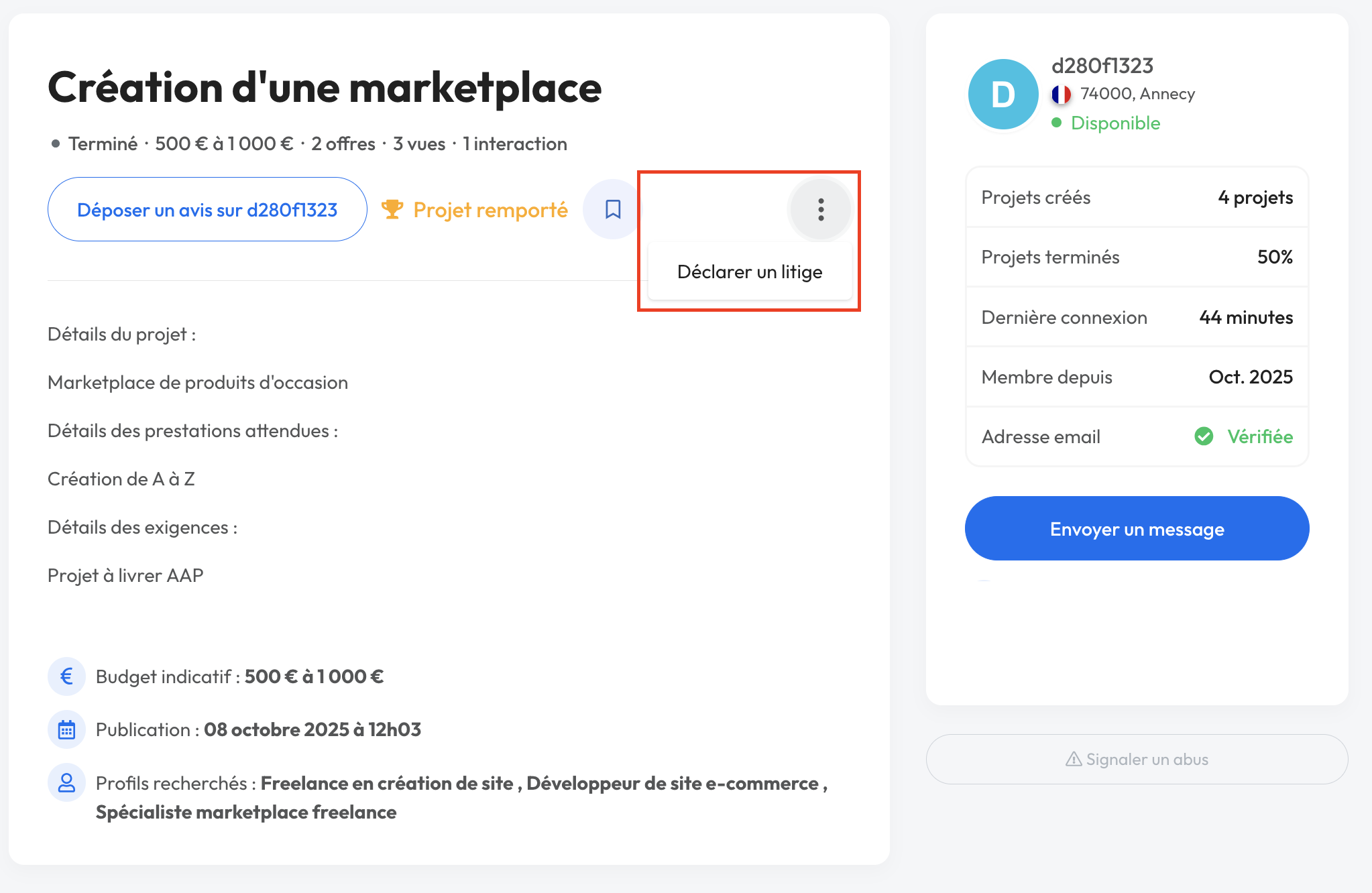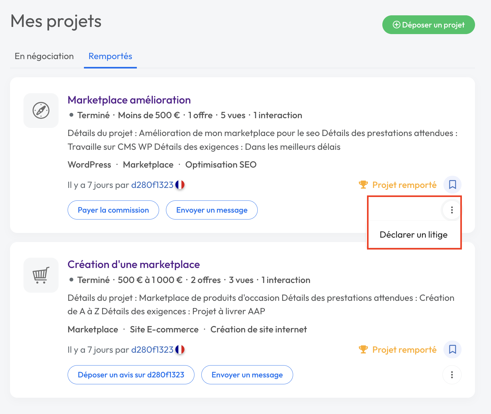 Vous pouvez accéder au formulaire de déclaration de litige à partir de votre liste de projets remportés, en cliquant sur les 3 points verticaux du projet concerné, puis sur "Déclarer un litige".