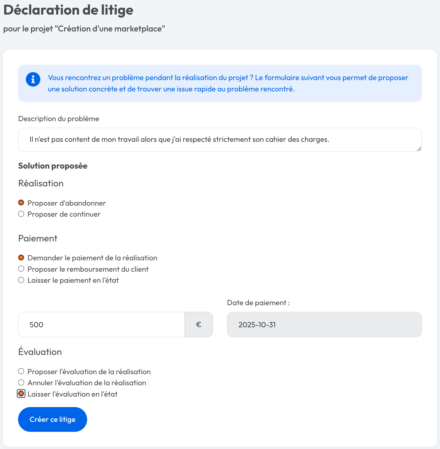 Attention, la déclaration de litige est uniquement possible si le projet vous a été attribué et que son statut soit "En cours" ou "Terminé".