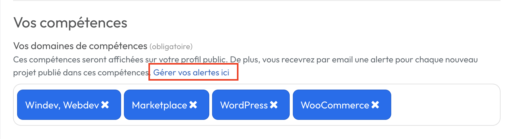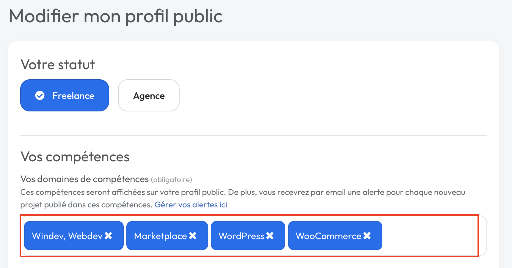 Lors de votre inscription sur Codeur.com, vous avez indiqué jusqu'à 5 catégories/thèmes de prédilection sur votre profil.