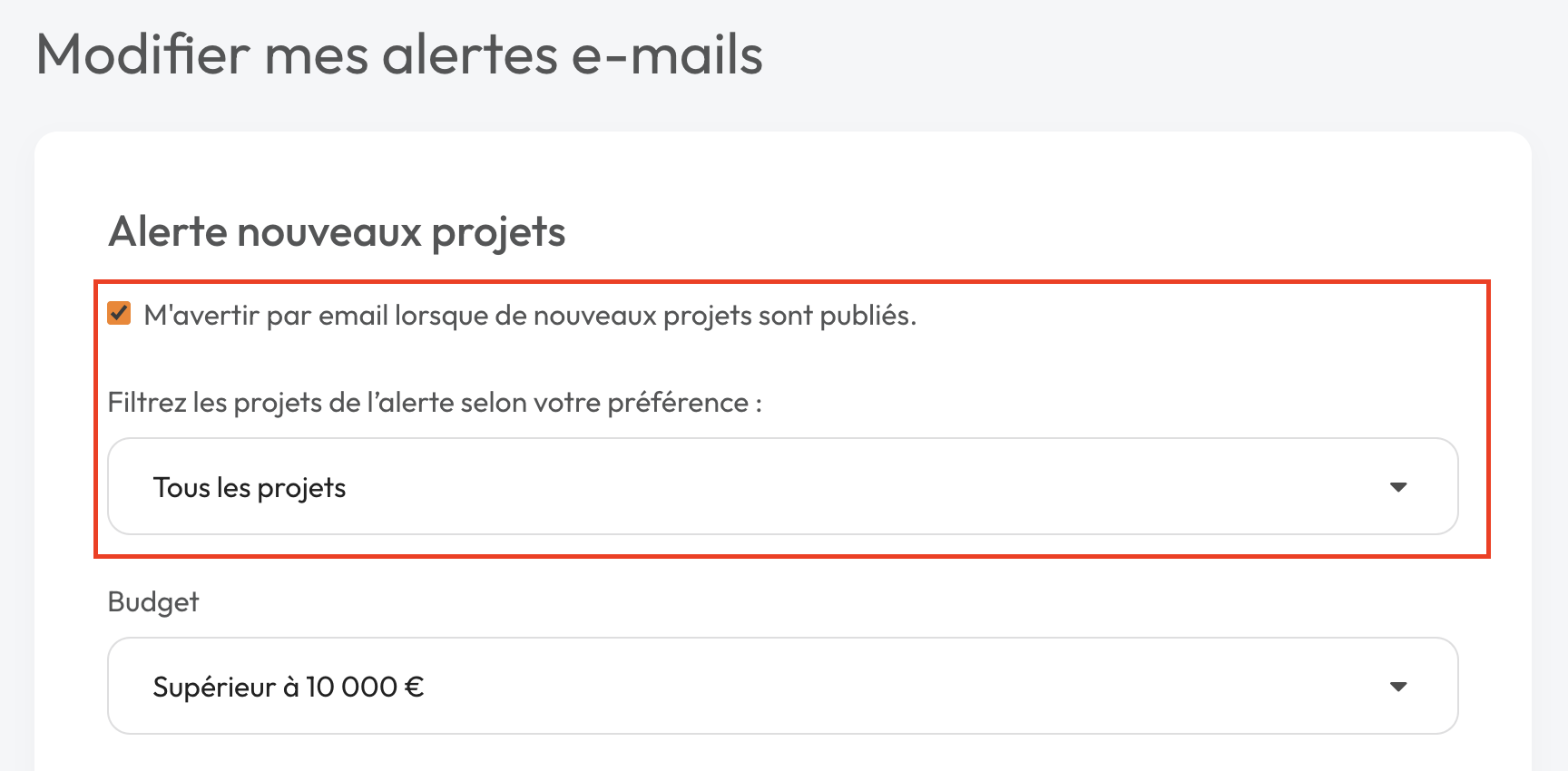 5. Accédez aux paramètres des alertes mails et cochez/décochez les cases qui vous conviennent. Utilisez aussi les filtres pour recevoir uniquement les projets publiés dans les catégories choisies et/ou en fonction du budget du porteur de projet.